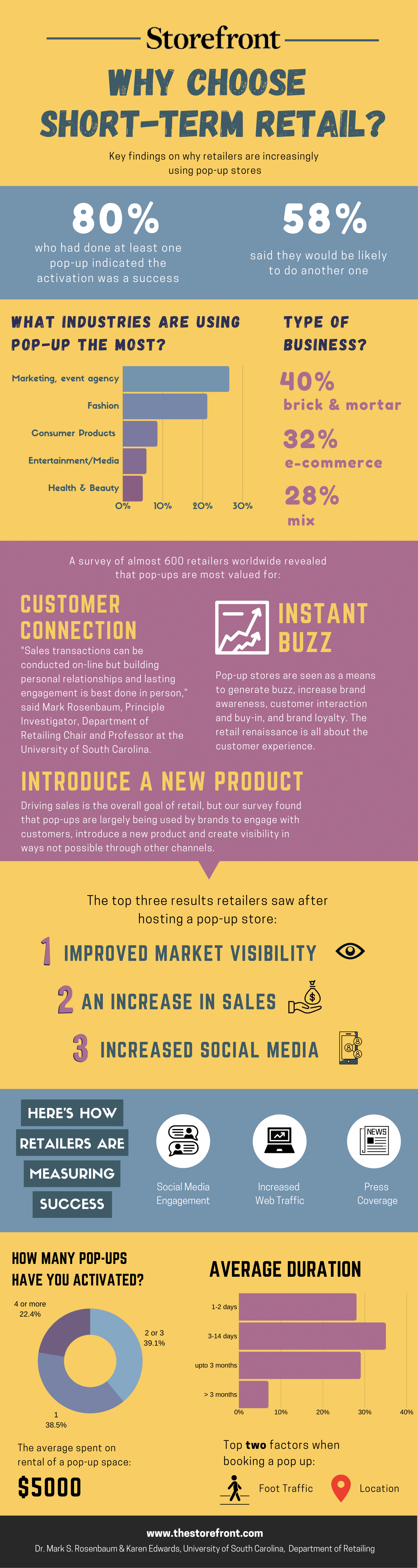 Storefront et University of South Carolina College of Retail ont interrogé 600 détaillants dans le monde entier sur leur opinion des pop-up stores, sur les raisons pour lesquelles ils choisissent la vente au détail à court terme et sur les résultats qu’ils ont constatés. (Psst : 80% des marques étaient satisfaites de leur expérience dans les pop-up !)