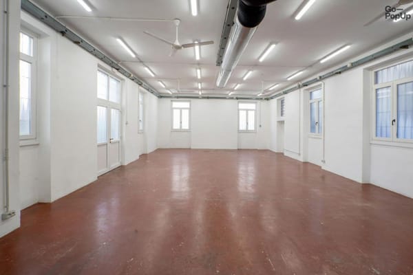 The space is half of a free-standing building in a courtyard. It has windows on three sides and an independent entrance from the courtyard.