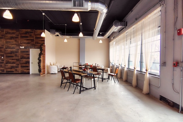 Designed for gatherings that feel warm, creative, and unforgettable. With exposed ceilings, dramatic ductwork, wood accent walls, stylish lighting, and an open floor plan, our venue blends urban style with cozy ambiance.