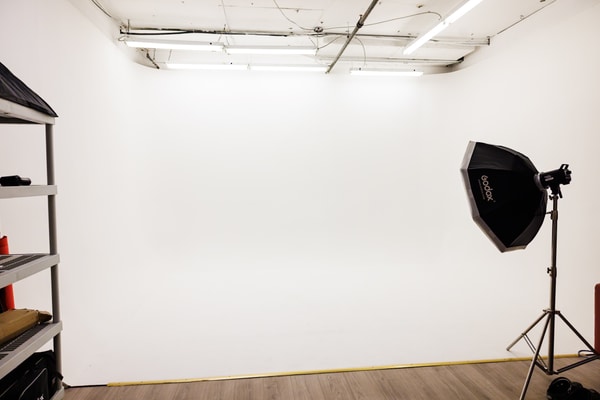 The studio features a clean white cyclorama wall, perfect for seamless backgrounds and professional-grade visuals. In addition, the space includes a styled lounge area with a bold...