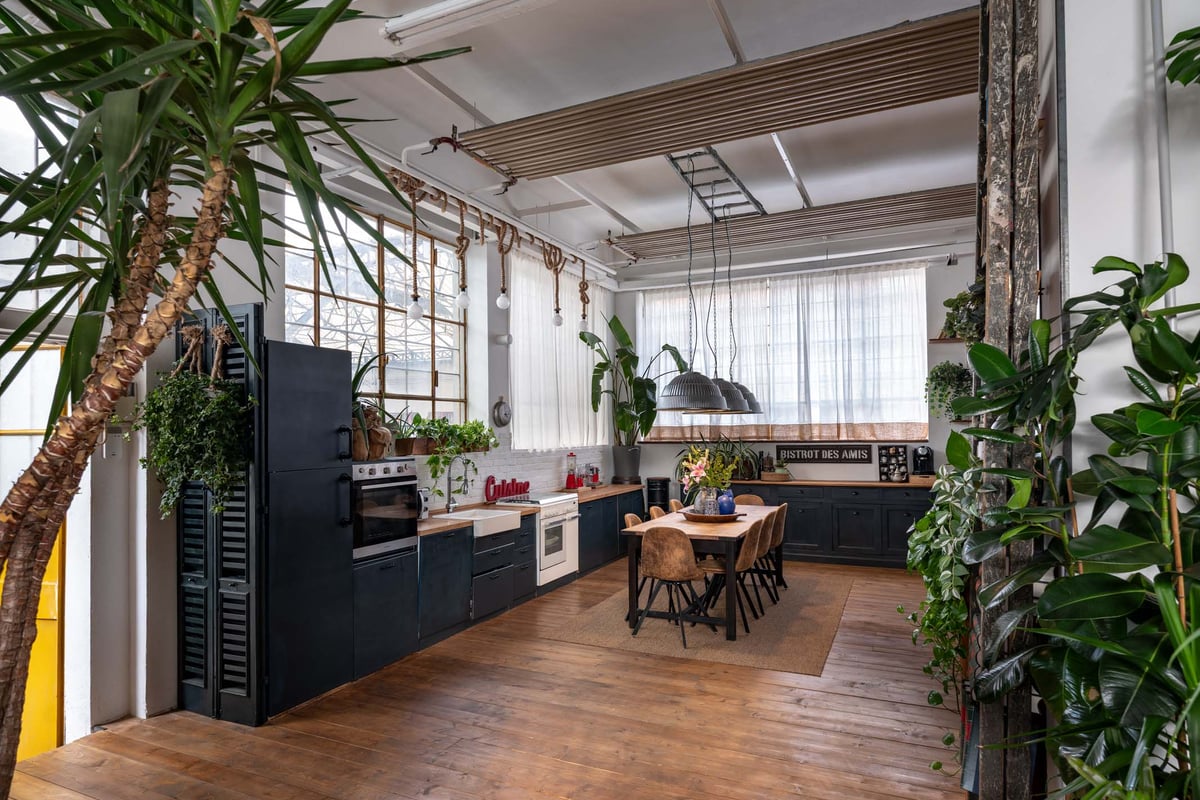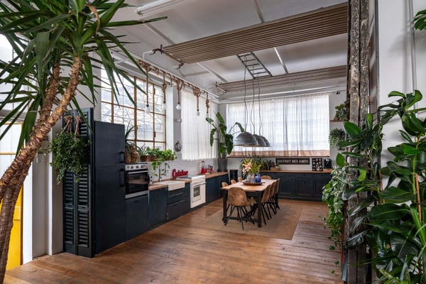 Loft ricavato da un ex capannone industriale. L'ambiente a pianta libera/open space è privo di suddivisioni rigide e muri ma c'è continuità tra zona giorno, cucina e area notte, definiti solo da elementi d’arredo o armadi.