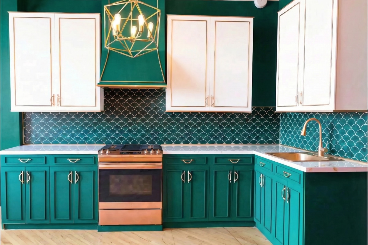 Our venue is a bold, designer kitchen set built for content. Rich emerald cabinetry, statement tile, warm wood, and gold accents create a fully styled, camera‑ready kitchen that reads instantly on photo and video. This scene is perfect for recipe content, food and beverage campaigns, lifestyle shoots, and branding for anyone whose work touches the kitchen.