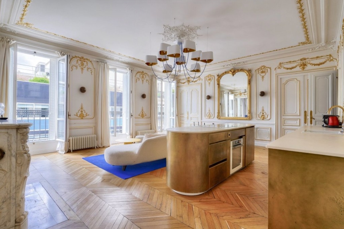 A wide, ambient entrance leads into a grand main room featuring 3-meter ceilings, abundant natural light, gilt picture walls, g...
