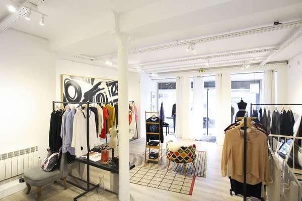 The ground floor room has elegant parquet floors, white walls and track and spotlights provide optimized lighting for displaying clothes and product.