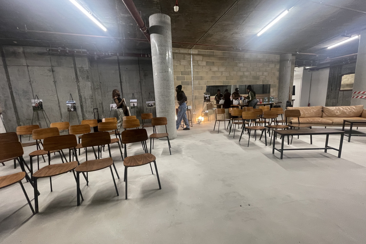 Our venue is housed inside a large, industrial-style concrete warehouse spanning 2,200 square feet with an impressive 4-meter ceiling height. The space carries a raw, atmospheric aesthetic—smooth gray concrete floors, exposed structural beams, and wide open sightlines that give it a minimalist, monolithic presence.