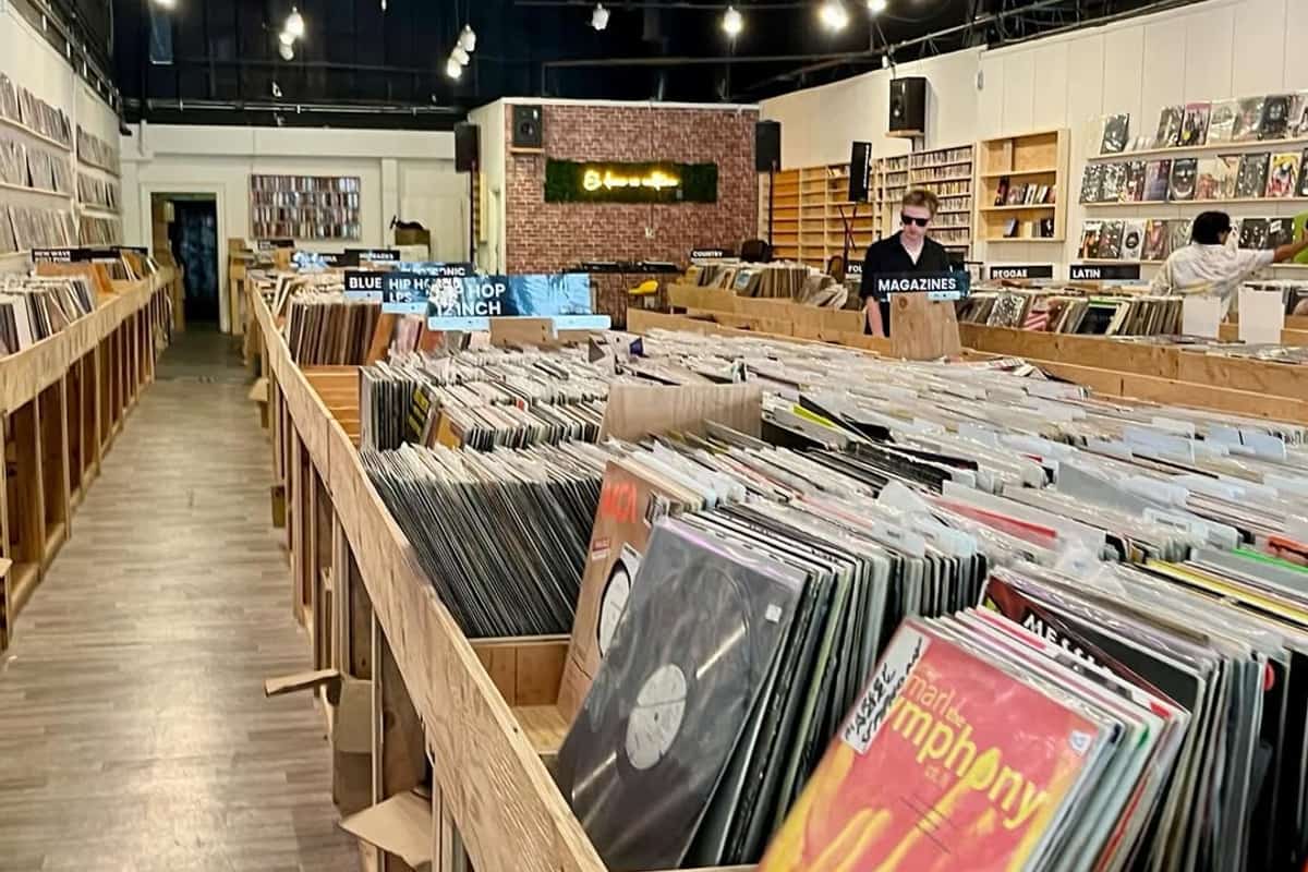 The main floor features wide aisles lined with vinyl, CDs, cassettes, and collectibles, blending a retro atmosphere with a modern edge. The space is has with natural light at the storefront, colorful displays, and a stage area that’s perfect for live music, intimate performances, panels an...