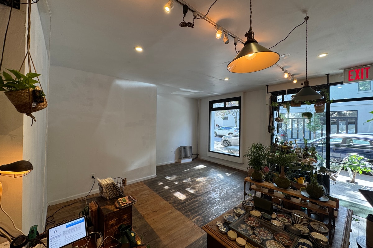 This 550 sq ft square-shaped space is shared with a Japanese bonsai plant shop that brings a cozy, green atmosphere to the space. It's a great collaboration opportunity, especially if your brand has a sustainable vibe. The space is perfect for retail, pop-ups, or art exhibitions. Your available space will be approximately 300 sq ft, offering enough room for a wide variety of creative or commercial uses while benefiting from the unique shared atmosphere.