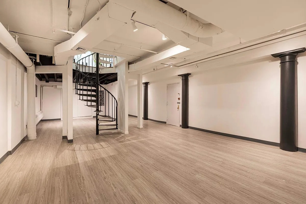 The open-plan layout features light oak floors, smooth white walls, black cast-iron columns, and exposed industrial ceilings with track lighting. A central spiral staircase adds character and verti...