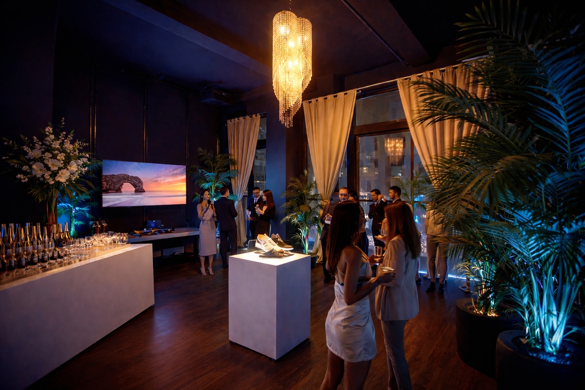 Featuring dramatic floor-to-ceiling windows overlooking Sixth Avenue, the space offers exceptional visibility from the street while maintaining the exclusivity of a private second-floor venue. The windows create a natural showcase for product displays, branded installations, and visual storytelling that captures the attention of pedestrians and invited guests alike.